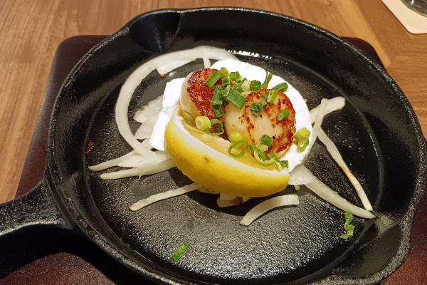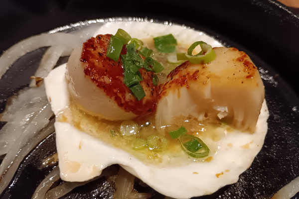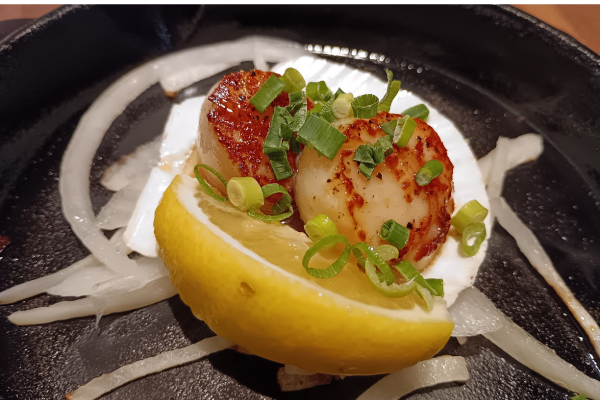 Vieiras naturales a la plancha con mantequilla y salsa de soja (¥638 (impuestos incluidos)).