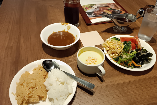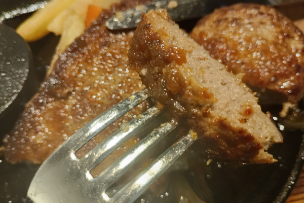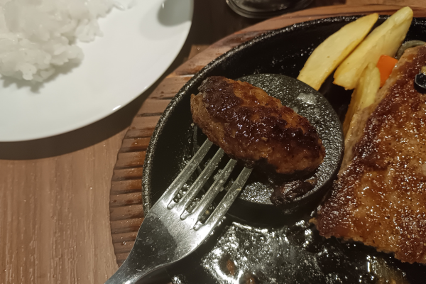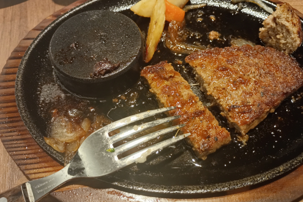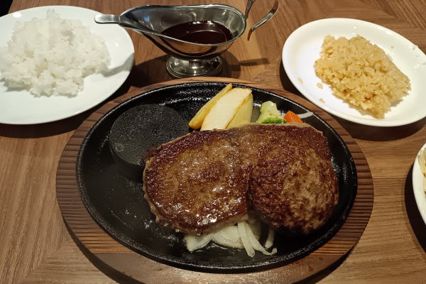 disfrutando del bistec hamburguesa para estudiantes de Gakusei, el bistec hamburguesa Asakuma y la barra de ensaladas