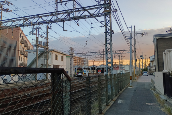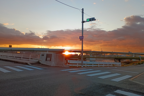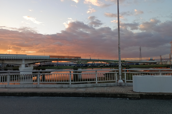 夕陽を妨げている高速道路の下を南海本線の鉄橋が架かります。